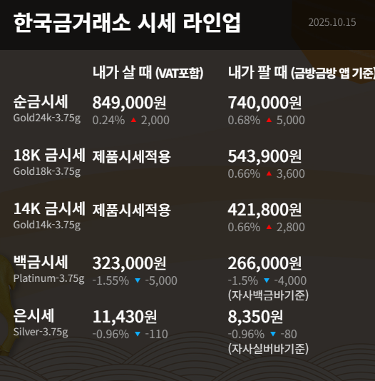 “오늘 14K·18K 금, 내가 팔면 실제로 얼마 받을까?”한국금거래소 기준 최신 데이터를 바탕으로 14K·18K 금시세와 1돈(3.75g) 기준 팔 때 받을 수 있는 금액을 정리했습니다.이 글 하나면 금값과 계